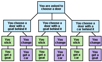 The basic riddle is: three doors, two have goats behind them, one has the car. Your aim is to pick the car. You pick one; then one of the other doors is revealed to have a goat behind it. You then get the option to stick with the door you have, or change to the other remaining door.